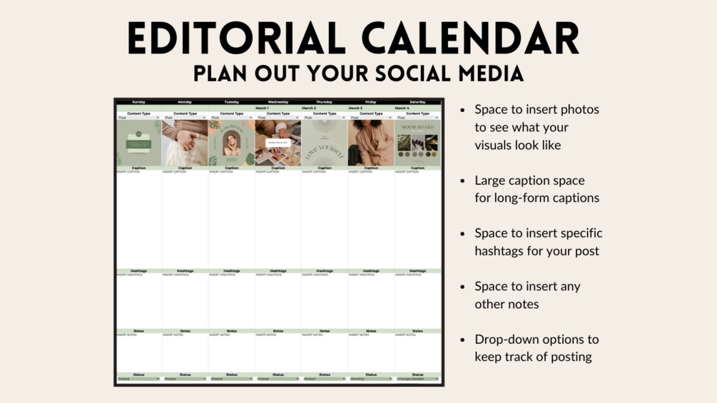 - Monthly overview page that allows you to organize your social media month ahead.