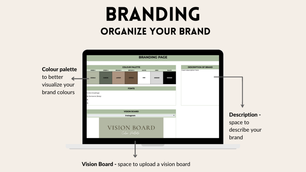 - A branding page to design your brand colours, fonts, and save your vision board all in one place.